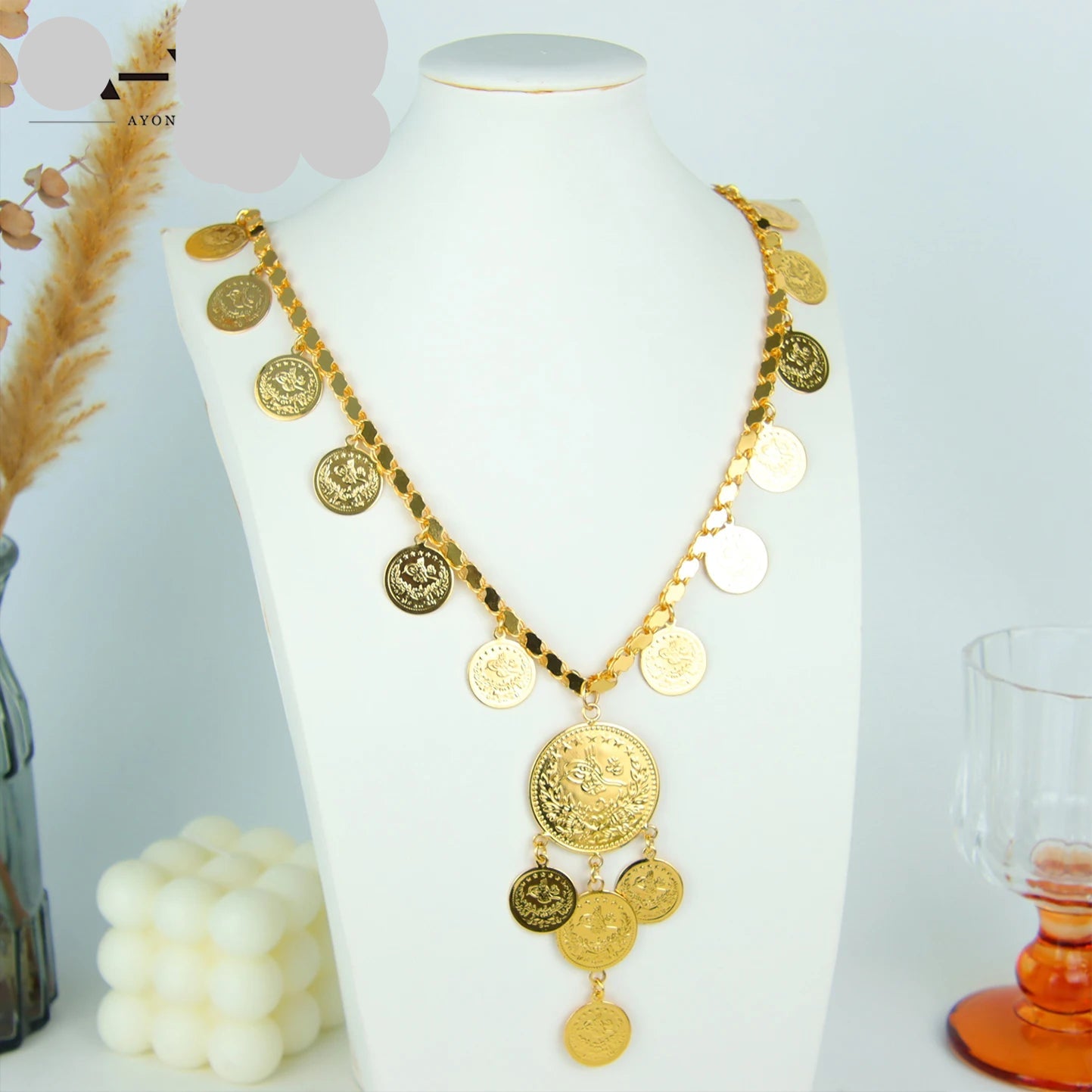 Luxury Dubai Wedding Long Necklace Coins Pendant 21k Gold Plated Jewelry