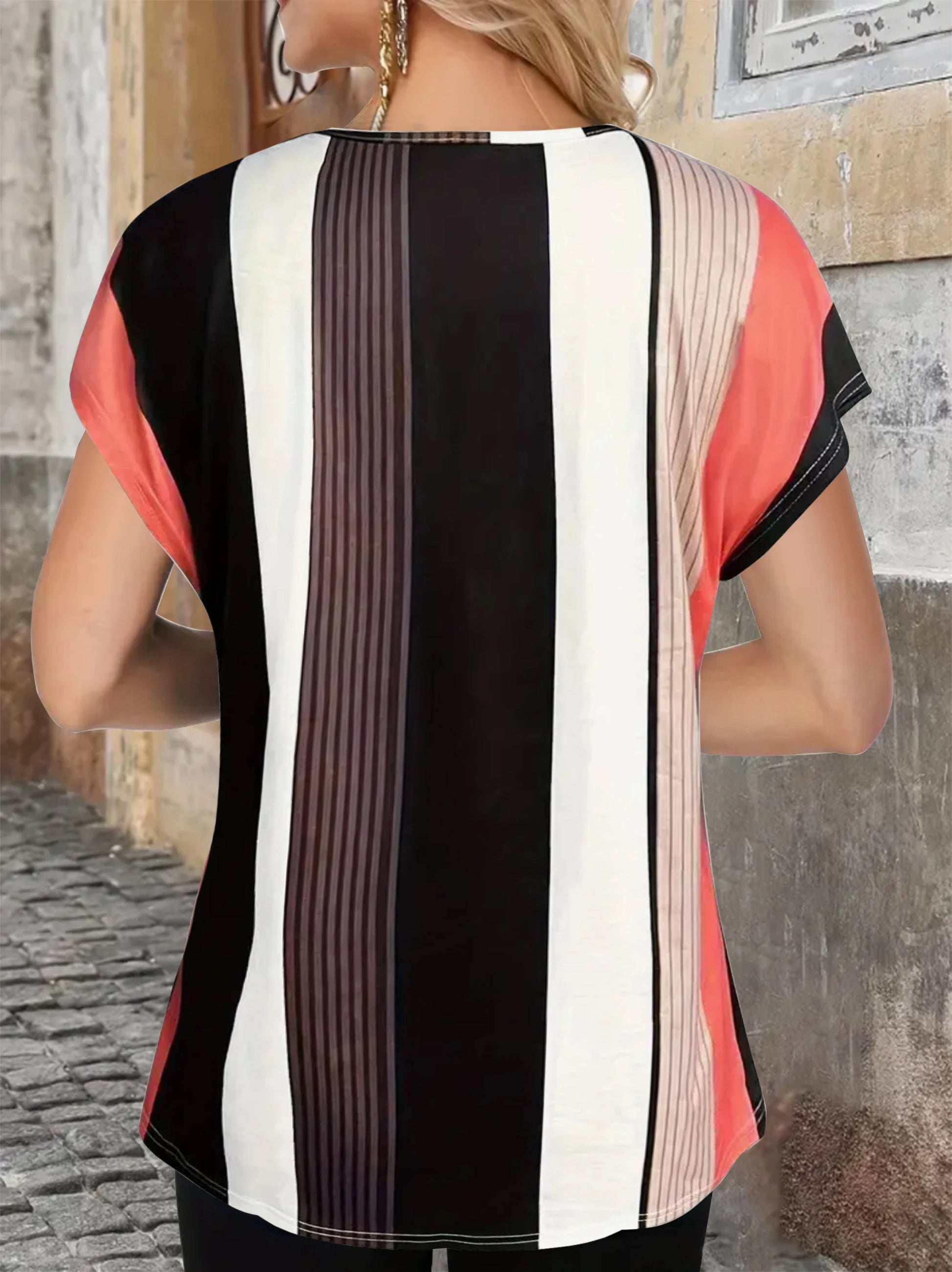 V-Neck Striped T-Shirt - Spring Summer Casual Elegant Blouse Top